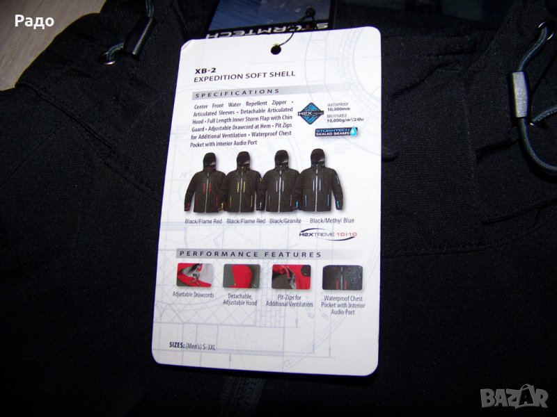 STORMTECH 3-слойна H2XTREME® 15,000 / 15,000 Водоустойчива / дишаща външна обвивка. Подлепени шевове. Джобовете са с гумирани ципове.Качулката е с козирка, двустранно пристягане и може да се сваля. Възможност за пристягане на талия и ръкави. 1ОО% водо устойчиво. Ципове за проветряване под мишниците. Цената в сайтовете на продукта е над 250 долара.