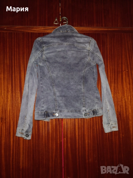 Дънково яке от състарен сив деним, без джобове. Подходящо е както за жена, така и за момиче. Размерът на якето по етикет - S, но е леко умалено, т. е. XS. Ширина от рамо до рамо - 33 см, дължина от рамо - 50 см, а на ръкава - 59 см (в неразтеглено състояние).