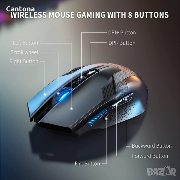 - Безжична гейминг мишка TECKNET, позволява работно разстояние до 15 м с никакво забавяне или падане на сигнала, не изисква драйвер (забележка: бутоните не са програмируеми)