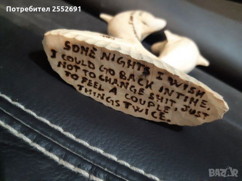 Дърворезба- делфини ръчно изработени с пирографирани надписи.