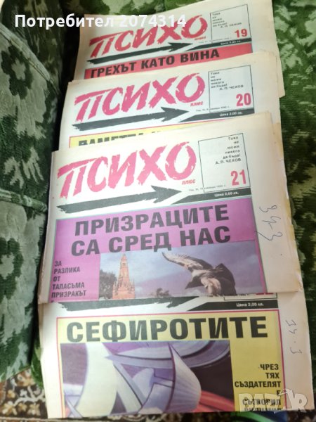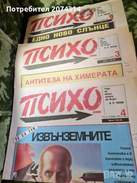Вестник "Психо"- 1990 - бр.9, 1991 - бр.5, 8, 20, 1992 - извънреден брой, 3, 4, 7, 12 13, 14, 18, 19, 20, 21, 22, 1993 - бр.5. по 2 лв. броя. Всичките 16 броя за 25 лв.