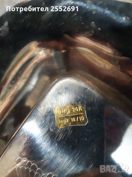 Метален,позлатен поднос. Наличие на надпис- ORO 24K INOX 18/10. Размери-22,5/23,5/3,5 см.