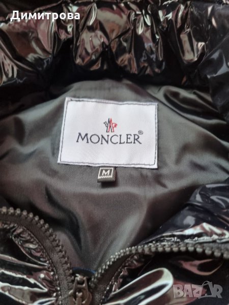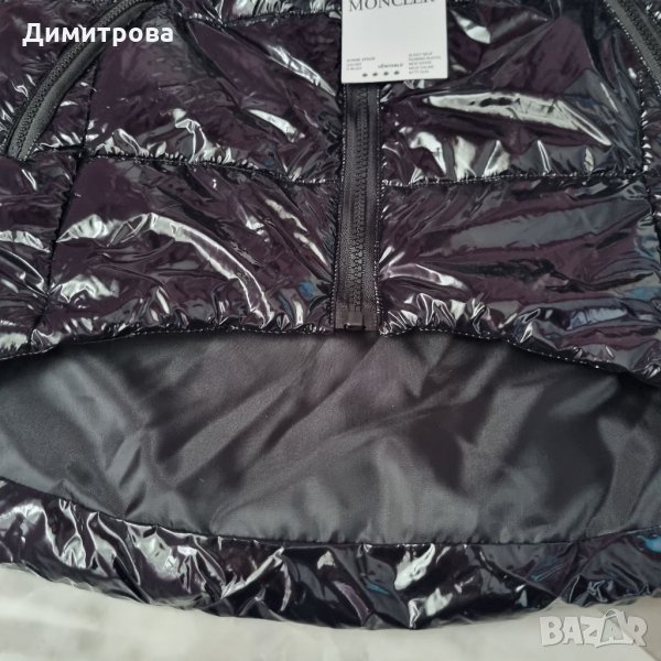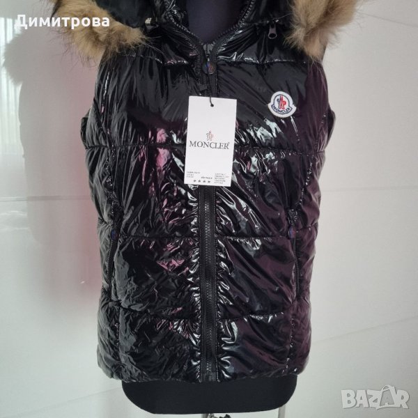 Елек черен лак Moncler. Качулката се сваля със ест.лисица.Асиметричен.Закопчаване с цип.2 джоба с цип