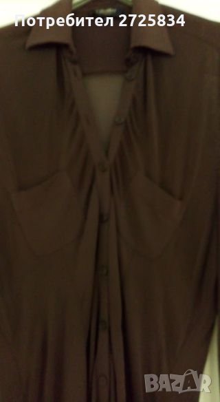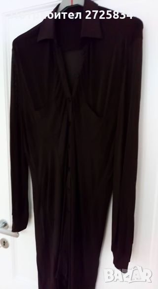Рокля MaxMara 'S Max Mara Designed for easy living, размер L. Цвят: тъмно кафяв, черен шоколад. Роклята е права, закопчава се с копчета. Има два джоба горе на нивото на бюста. Роклята е без колан, свободна. Тип риза-рокля. Състав: 84% вискоза, 11 % полиамид и 5% еластан. С дълги ръкави. В много добро състояние.