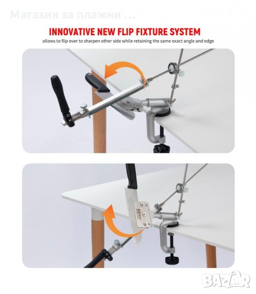 Компактен дизайн, който лесно се побира в кухненския ви шкаф. Не е необходимо да сте експерт, за да използвате уреда, защото това точило е изключително лесно за изполване. Само го сглобете веднъж като следвате инструкциите за употреба и го поставете на кухненския плот. Закрепете острието като фиксирате ъгъла на заточване и започнете да движете металната пръчка с камъните напред и назад. Супер бързо и удобно може да сменяте различните камъни спрямо вашите предпочитания. Уредът е конструиран с дизайн за безопасност – дръжката е в горната част и никога няма да нарани ръката ви, когато я движите напред и назад. След употреба измийте и подсушете точилото. Това е един много полезен уред за всяко домакинство, който със сигурност трябва да имате, за да си спестите неприятности.