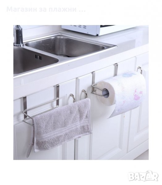Метална поставка за кухненска хартия, която се закача за кухненска вратичка или шкаф. Практичен кухненски органайзер за кухненска хартия, кърпи или други кухненски принадлежности. Не са необходими инструменти за поставянето ѝ – просто я закачате за вратичката или шкафа и готово! Широко приложение – може да се използва и в гардероба, в банята и навсякъде, където може да се постави.
