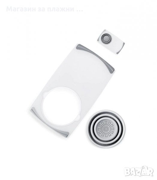 Оригинална и универсална дъска за рязане с вграден сгъваем гевгир, който може да се ползва, като подвижен контейнер за съхранение на храна или отпадъци. Тази многофункционална кухненска дъска спестява място и може да се използва в различни позиции. Идеална за белене, рязане и измиване на храна с пълно удобство, като се избягва използването и замърсяването на различни прибори. Регулира се към мивката и се отстранява лесно за почистване и съхранение.