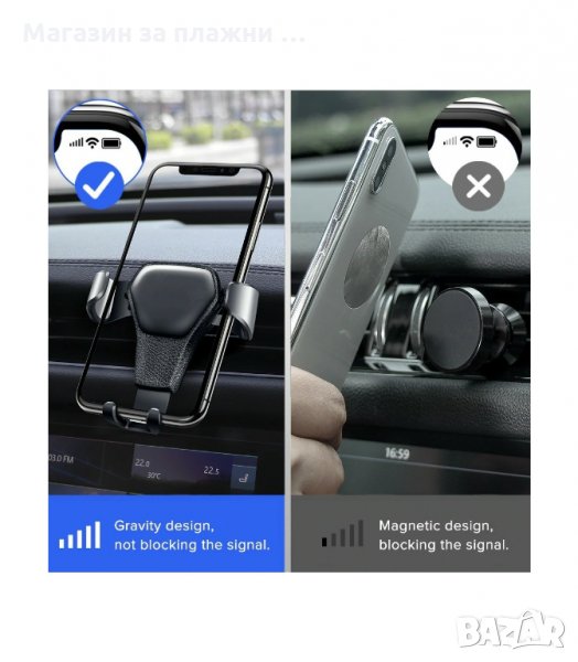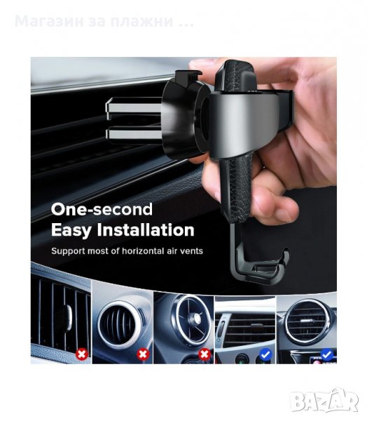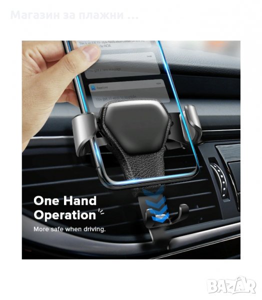 Стойката се захваща за въздуховода на автомобила и държи телефона много стабилно при неравности, дупки и черен път. Раменете на стойката се стягат гравитационно при поставянето на телефона. Ако често се чудите къде да оставите телефона си, докато шофирате и искате той да е на една ръка разстояние, то тази стойка е вашето решение.