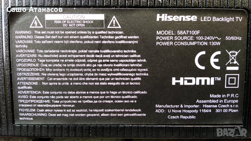 Hisense 58A7100F със счупена матрица ,RSAG7.820.9502/ROH ,CV580U1-T01-CB-1 ,WTA1M2500 ,HD580X1U91-L1