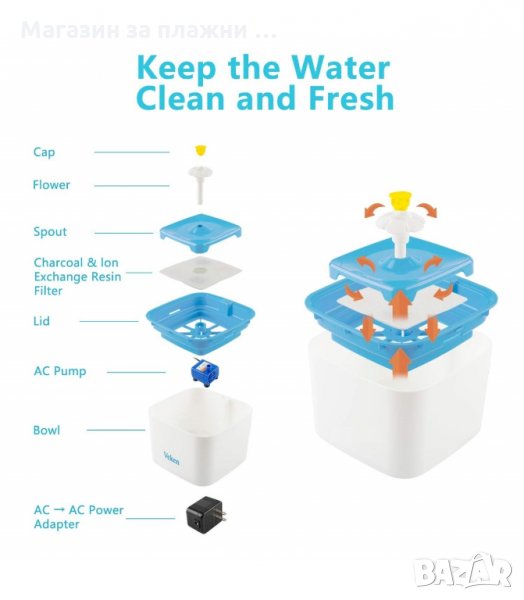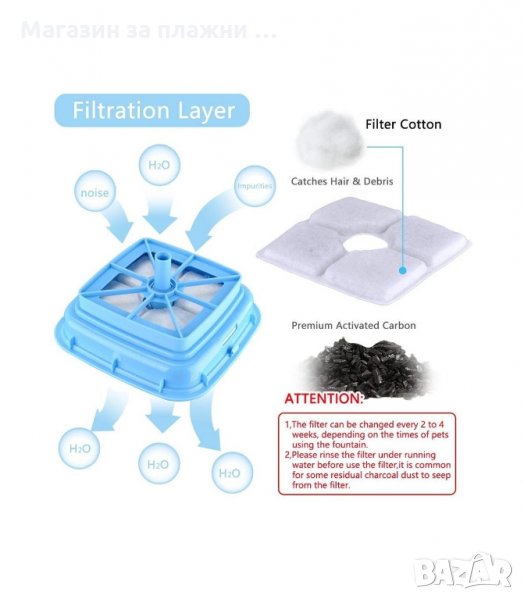 Фонтанът за пиене е не само красив, но удобната му височина го прави идеален за котенца и големи котки. Лесното разглобяване също прави почистването на кладенеца много лесно. Включва активен въглен (нощните филета се продават отделно). Филтърът почиства и втвърдява водата от чешмата, докато филтрира косата, утайките и примесите.