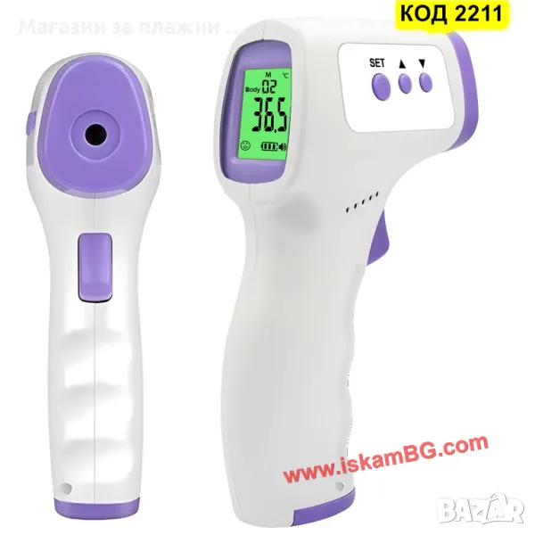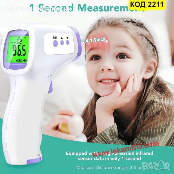 Инфрачервеният термометър измерва температурата без пряк контакт с кожа и повърхности. Работи на разстояние между 3и 10 см, като се насочва към челото на човек или повърхността на обект. Предлага най-безопасния начин за измерване на температура – без риск от разпространяване на инфекции при допир.