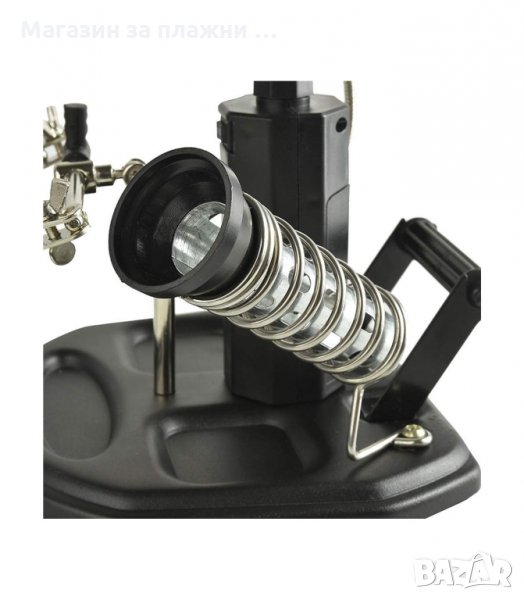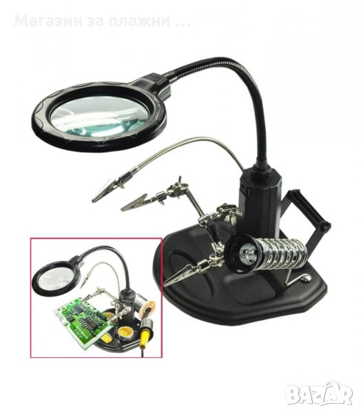 Тя ни позволява да фиксираме частта неподвижно с помощта на скобите(крокодил), а висококачествените лещи осигуряват перфектно увеличение на обекта без значение размерите му. Включени са две допълнителни мини-лещи, които са инсталират под основната и имат диаметър 35 mm и увеличението им е 2х или 5х. Третата ръка има led подсветка, която свети ярко (5 светодиода) и се захранва както от батерии, така и от 220V.
