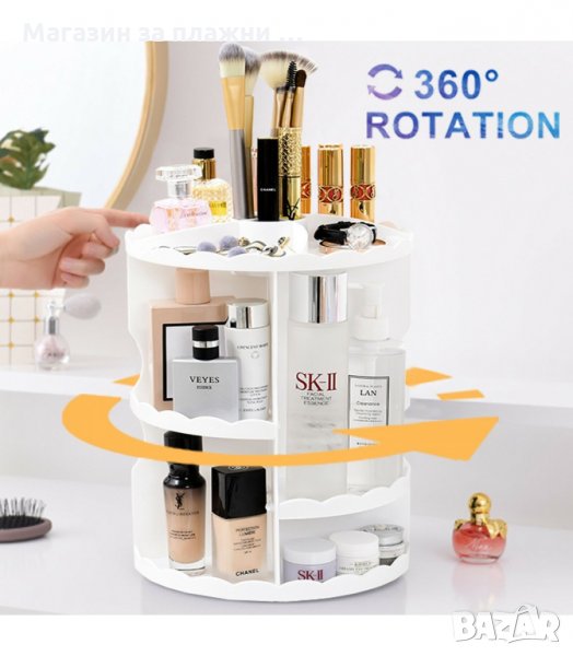 Въртящия се на 360 градуса органайзер е чудесно допълнение към Вашата домашна гримьорна като едновременно прилежно подрежда използваните от Вас продукти и спестява място.