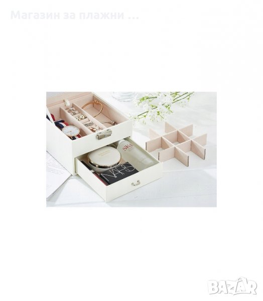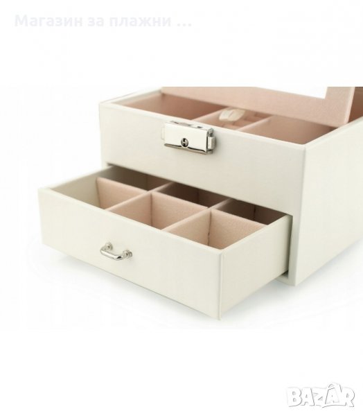 Кутията разполага с изтеглящо се чекмедже, а също и с основно отделение от три части като средната е специално за пръстени и обеци. Освен за бижута, кутията е подходяща и за козметика бяла или декоративна. Така получавате специално място за любимите си продукти, тези които използвате ежедневно или пък за добро организиране по време на пътуване.