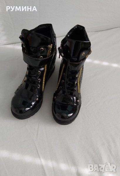 сникърси с вградена платформа. Действащи два ципа - златни и вързанки. Размер на стелката 24.5-25см. Височина на цялата обувка - 19 см. височина на платформата 9см. № 39