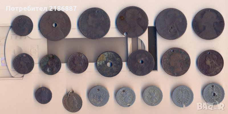 Дупчени монети от 19 век, 20 броя, предимно от Великобритания и Франция. Били са използвани като медальони и копчета.