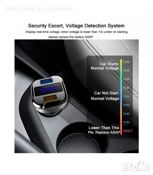 Тук Ви представяме зарядно за автомобил,на чийто дисплей му се изписва волтажа на акумулатора, То има защита от претоварване. Захранването му автоматично се изключва, ако напрежението е по - голямо от необходимото.Трябва да извадите устройството от запалката и пак да го поставите. Всеки от двата USB порта е с изходен ток 3.1 А и е подходящ за зареждане на всякакви устройства.