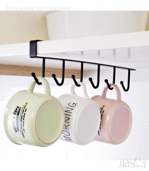 Метална стойка, закачаща се за рафт. Поставка за чаши с дръжка или кухненски прибори. Мултифункционална - използвайте я като органайзер за чаши за кафе или чай, органайзер за кухненски прибори, органайзер за вратовръзки в гардероба, или като органайзер за колани, шалове и други.