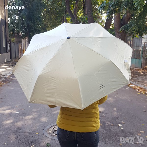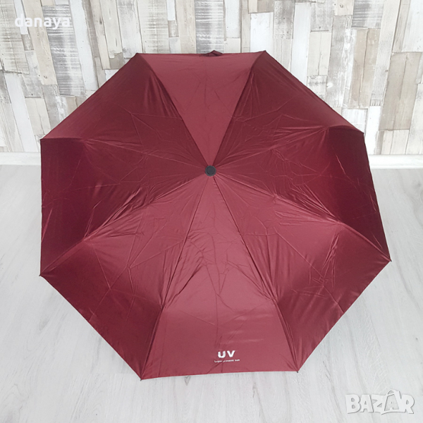 Едноцветен чадър с UV защита от слънчевите лъчи. Автоматичен чадър за дъжд, двойно сгъваем. Класически чадър с метална основа, 8 метални спици. Автоматично отваряне и сгъване само с едно копче. Две степени на сгъване. Компактен размер в сгънато състояние – 28см. Може да се побере във всяка чанта. Предлагат се в различни стилни цветове.
