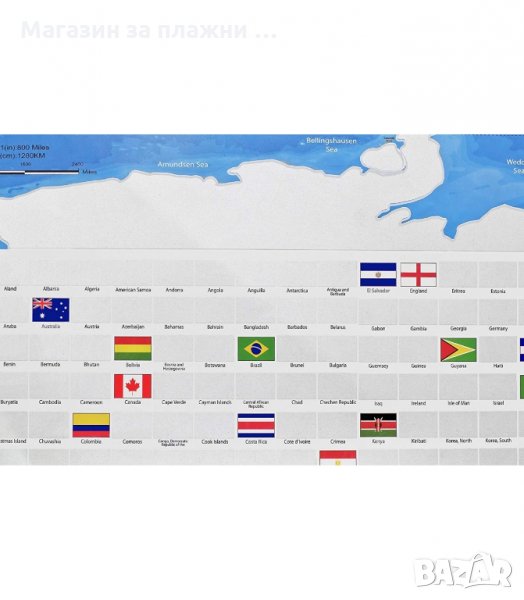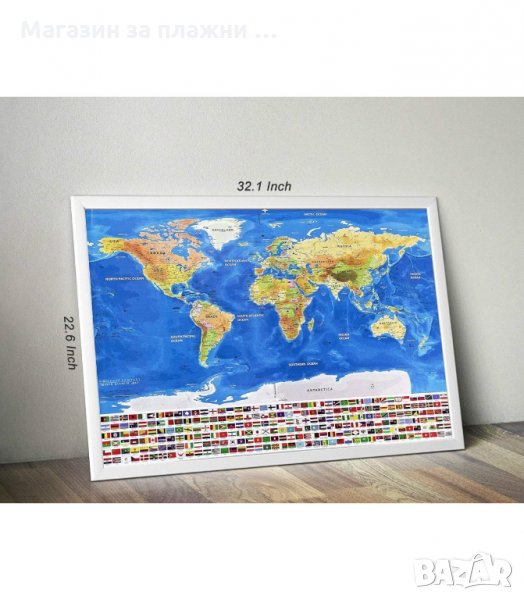 Световната, скреч карта в тази оферта притежава всички качества на класическата скреч карта на света като тук са добавени знамената на държавите които може да изстриете и научите в същото време.