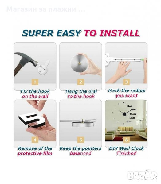 Този часовник е с безшумен и точен часовников механизъм. За да го сглобите лесно и правилно, трябва да поставите листа с образеца за разположението на часовника върху стената и да го закрепите с малко тиксо, за да е неподвижен. След това да очертаете с молив и точици празните места на цифрите на стената.
