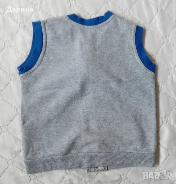 Детски елек ( лека вата ) за момченце . Размери в закопчано положение : Дължина : 38 см / Ширина едностранно : В рамене : 26 см / Под мишници едностранно : 34 см / В кръста завършва с разтеглив широк ластик , неразпънато едностранно : 33 см . Изпращам с Еконт за сметка на купувача .