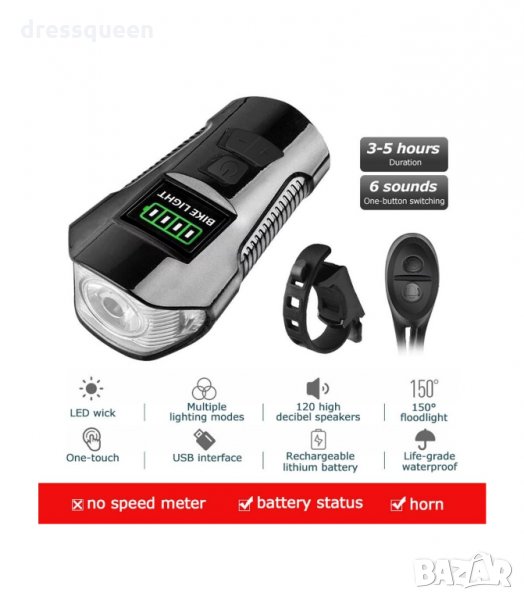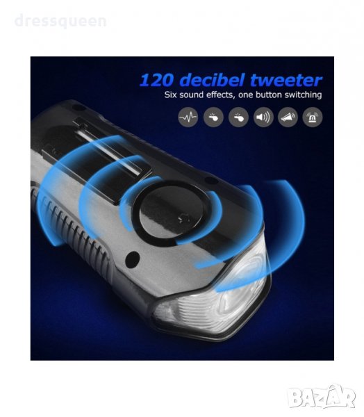 Акумулаторен Фенер за колело със сирена с 6 различни звуци и 4 режима на светене