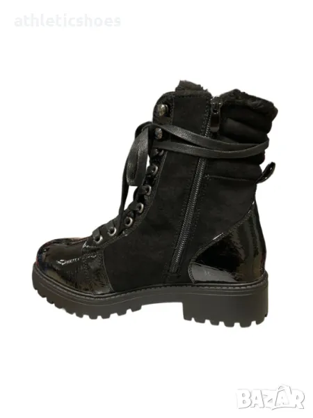 Елегантни дамски боти от еко велур и лачена кожа, отоплен вътрешен хастар, удобна мека подметка с грайфер, с връзки и цип за лесно обуване.