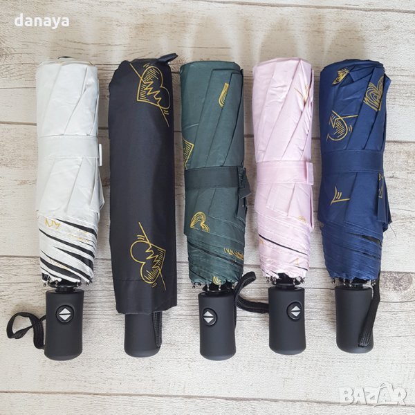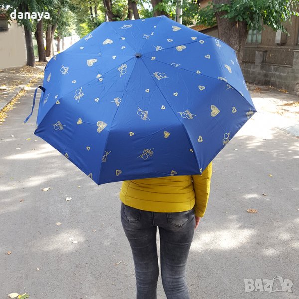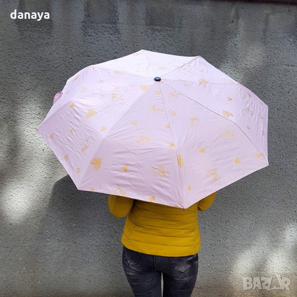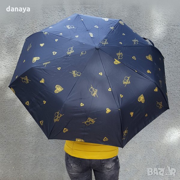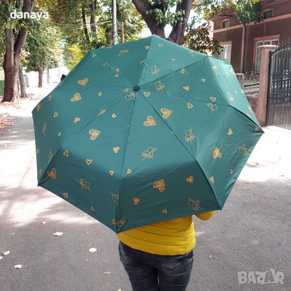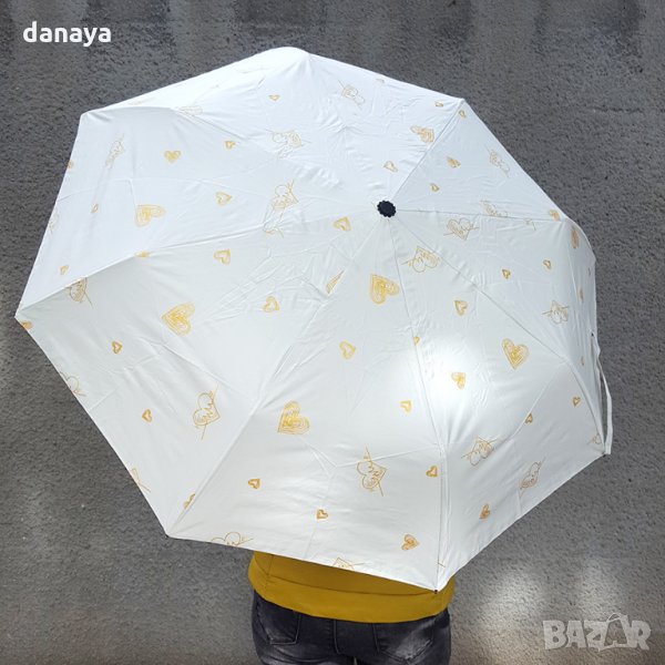 Сгъваем автоматичен чадър за дами, които обичат живота и които са винаги влюбени в красивото. Чадърът е с принт на множество златни сърца, изобразяващи същността ни – да излъчваме любов!.. ❤💖💕