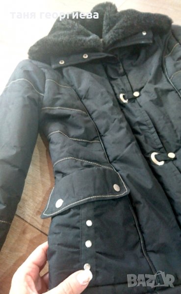 Зимно кокетно яке в черен цвят с бели шевове и външни джобове