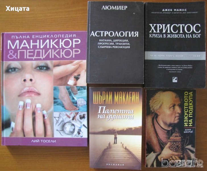 Козметика Том 1- 2- 3.Помагало за присъствения курс,Зл.Папазова,Ст.Миланов,А.Българанова и др.,ПУ Комплексни услуги,София.1990г.686стр. - 90лв Пълна енциклопедия Маникюр & Педикюр,Лий Тосели,изд. Ахат,2007г.128стр. - 120лв. Астрология Т.1: натална, дирекции, прогресии, транзити, слънчевареволюция,Люмиер ,Издателство "Хадес" ,1995г.800стр. - 150лв.Любов, брак и... астрология на партньорството.Метод на полупунктовете,Милена Ставрева,Перфект Консулт,2010г.280стр.Отлична! - 70лв Най-добрият начин да научим астрология.Том 2 Техники за изчисляване и интерпретация,Марион Марч,Джоан Макевърс,Аратрон,1999г.370стр.Отлична,с даритетелски надпис! - 50лв Номерологичен календар.Личен помощник за всеки ден,Муси Дачева,Хермес,2001г.416стр. - 50лв. Магическата сила на числата.Вечен хороскоп.Нумерологичен хороскоп,Пол Родриго,Световит,2001г.318стр. - 60лв Изкуството на подкупа,Ахим Шварце,Атлантис,1992г.204стр. - 55лв. Христос: Криза в живота на Бог,Джeк Майлс,Ибис,2009г.368стр. - 65лв. Паметта на душата,Шърли Маклейн,Обсидиан,2008г.296стр. - 45лв.