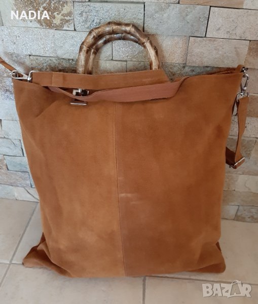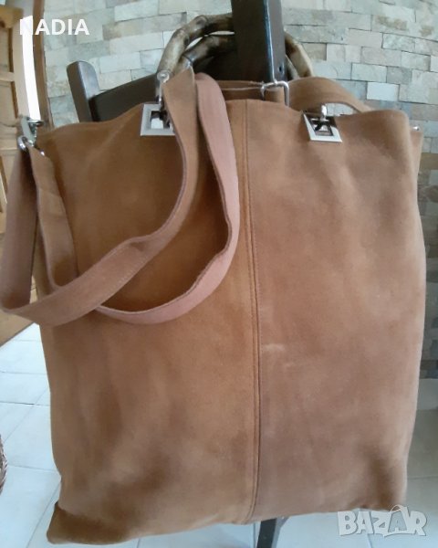 Нова чанта от естествена кожа, от едната страна кожата е от пони ,а от другата е велур. Два вида дръжки-къси кокалени и дълга от велур. С една преграда и джоб за телефон. Пасторът е от плат.