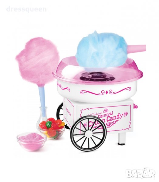 Изненадайте семейството си с оригинален и любим домашен десерт! Умален модел на карнавалните машини за памук, тя може да превърне любимите Ви бонбони в пухкав десерт. Машината е с компактни размери и залепващи за повърхността крачета. Можете освен обикновена захар да поставяте и твърди бонбони, а употребата и е изключително лесна.