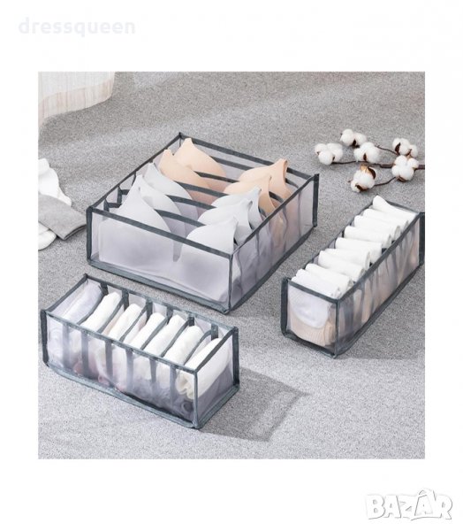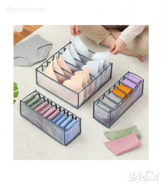 Размери: органайзер за сутиен със 6 пространства (12x 32x 32 см), органайзер за чорапи с 11 пространства (12x32x12cm), органайзер за бельо със 7 пространства (12x32x12cm)