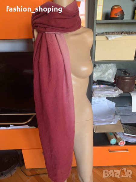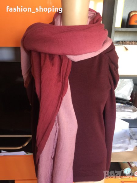 С този шал омбре ( в преливащи тонове) от розово в бордо ще бъдетв неотразими. Изключителен акцент към облеклото, който мигновено приковава погледите. В съчетание с розова дреха или в цвят бордо стои невероятно красиво. Аз лично съм демонстрирала със снимки как се съчетава с палто в розово и можете сами да видите ефекта. Шалът е на Massimo Dutti. Материята е вълна и памук( изрязала съм го, защото беше много дълъг). На допир е много мек и създава усещане за топлина и уют. Асксесоар, носещ силен, освежаващ заряд през сивите хладни/ студени предстоящи месеци.