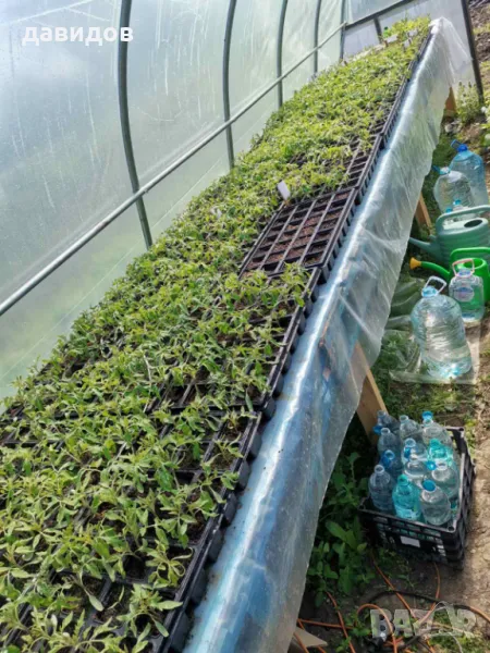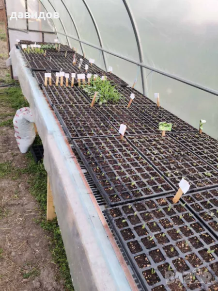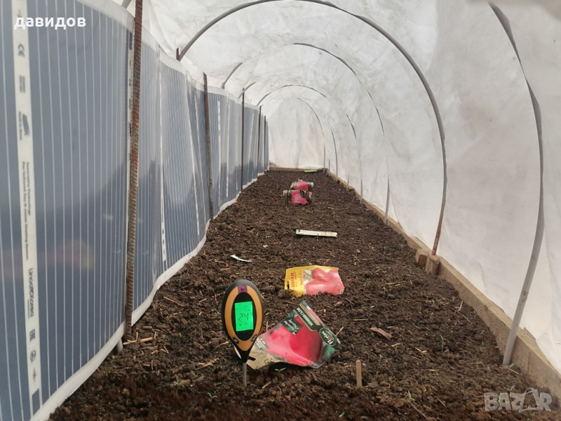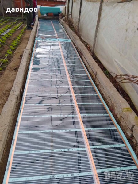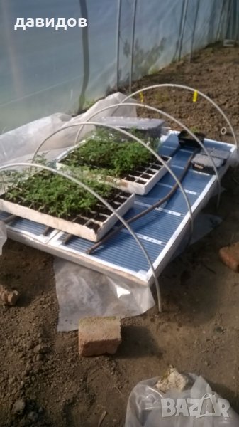 ето изпробван, икономичен вариант на отопление за всякакъв вид растения. Разсад, цветя, лозички и всякакви други.Върху масата с карбон филма се постила балатум или найлон и върху него се поставят саксийки, тавички, сандъчета или каквото е нужно за растенията. С термостат най-често се следи температурата вътре в почвата за оптимален режим. Работи безотказно на много места в цяла България. На снимките съм показал всякакви варианти - от професионални отопления за големи оранжерии с десетки кв.м. площ до малки домашни ,хоби оранжерии .Размерите са по заявка наклиента. Например малко отопление за цветя или разсад в къщи с размери 1.25 х0.5м, заедно с термостата струва48 Евро.