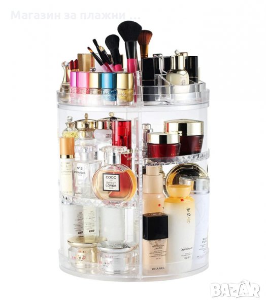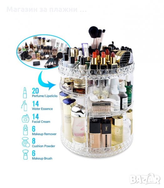 Стелажът събира около 200 предмета и е достатъчен, за да може всичко да е подредено, видимо и лесно за достигане. Просто завъртате и оглеждате всичко, избирате си и след употреба поставяте отново на мястото му. Няма да го има неприятно натрупване върху шкафчета и купчини върху тоалетката. От четката за зъби и почистващите лицето продукти до сенките и гланца завършващи стайлинга Ви. Организирайте себе си и времето си, събирайки всичко, което ви е необходимо на едно място за бързина, комфорт и подреденост.