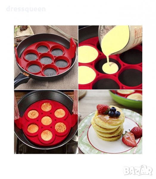 Силиконовата форма позволява по лесен начин да приготвите 7 броя палачинки или яйца само с едно пържене. Формата се обръща лесно, защото след като се запържи леко сместа остава в специалните отвори на формата, а Вие можете преспокойно да обърнете и изпържите от другата страна палачинките или яйцата.