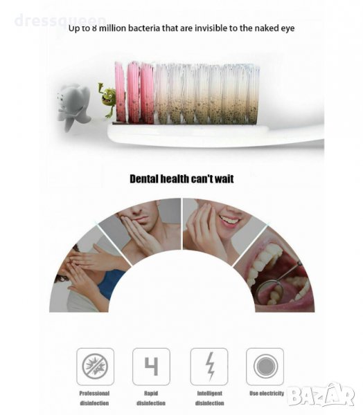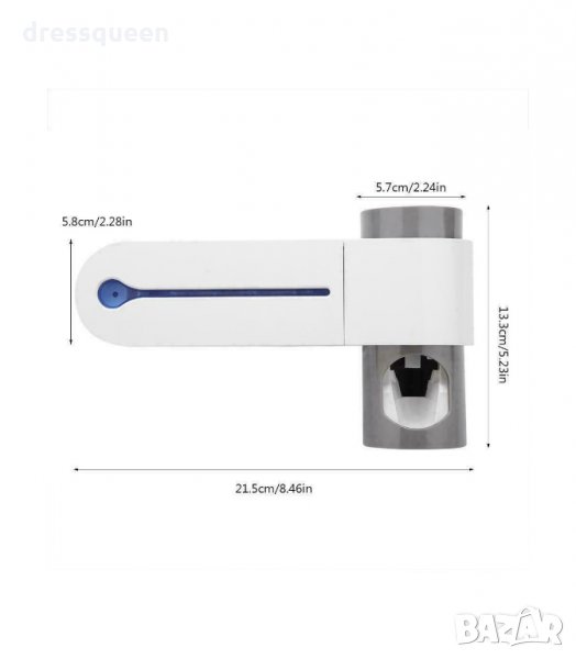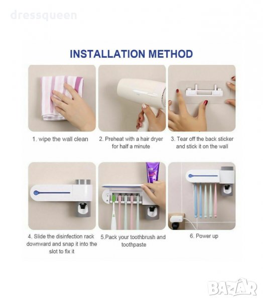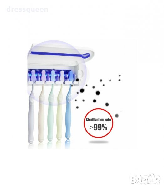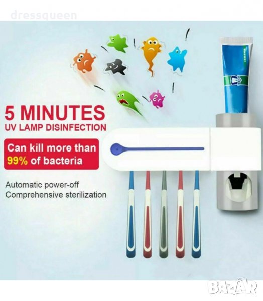 Пълен и ефективен многофункционален 3-в-1 UV стерилизатор за четки за зъби, с дозатор за паста за зъби и поставка, която се закрепва към стената чрез лепяща фиксация. Този семеен държач за четки за зъби побира 5 четки за зъби, още повече е подвижен за лесно почистване. Идеален за постигане на по-удобно и безопасно четкане, предпазвайки четките от бактериално замърсяване чрез ултравиолетова светлина, която ги дезинфекцира бързо и лесно, като елиминира бактериите и микроорганизмите за няколко минути.