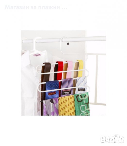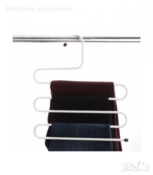 S-образна закачалка за поли, панталони, вратовръзки, кърпи и други. С тази закачалка органайзер ще спестите място в гардероба и дрехите, подредени на нея няма да се измачкат. Побира няколко чифта наведнъж.