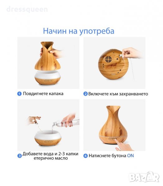 Арома дифузер с етерични масла за домашна ароматерапия е иновативен продукт, който разпръсква вода и етерични масла в дома ви. Добавете в резервоара вода и няколко капки от любимите ви етерични масла.