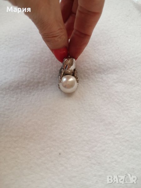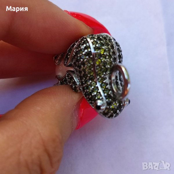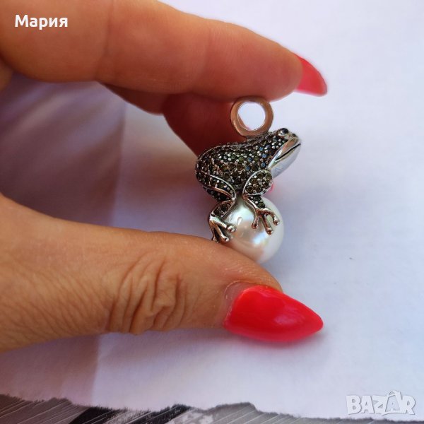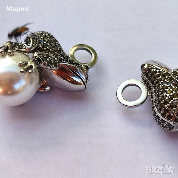 Масивна сребърна висулка във формата на жаба с инкрустирани полускъпоценни камъни и голяма бяла перла. Проба 925.
