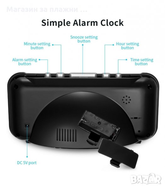 Настолен електронен часовник с големи светещи цифри. Изключително силен дизайн с леко извита форма, удобна регулируема поставка и голям огледален дисплей 1.8 инча. Часовникът визуализира часа с големи светещи цифри. Има опция за настройване на аларма и променяне яркостта на светлината. Захранване от електрическата мрежа от 220V; Резервно захранване от 2бр. ААА батерии (не са включени), когато няма електричество; Размери: 23 х 10.3 х 5.6 см.