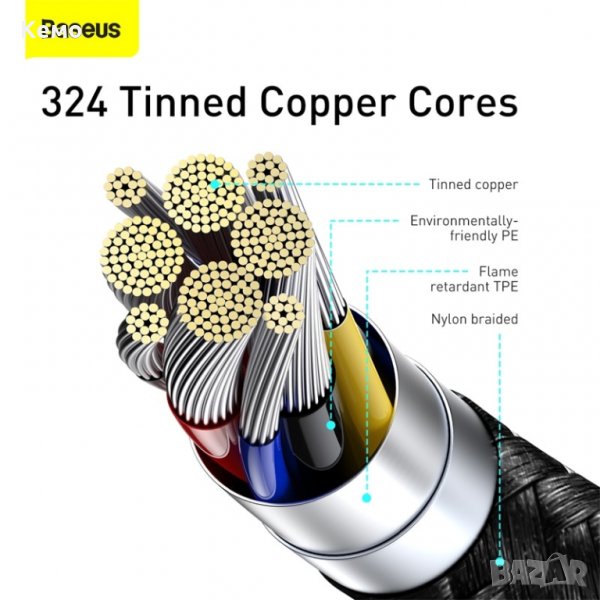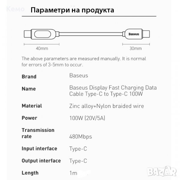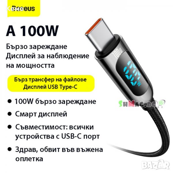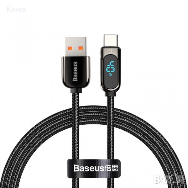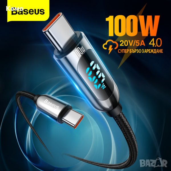 Baseus PD 100W USB C към USB Type C кабел за бързо зареждане и трансфер на данни с цифров дисплей, показващ мощността на зареждане на устройства с Type C порт.