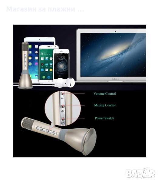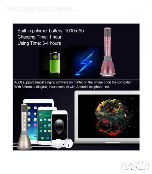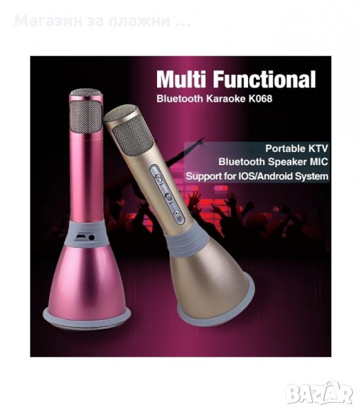 Безжичният блутут караоке микрофон с вграден говорител представлява комбинация от микрофон и говорител, свързващи се с всяко устройство с блутут – мобилен телефон, таблет, компютър и други. Така имате всичко, което ви е нужно – музика, микрофон и спийкър, от който се чува вашето изпълнение.