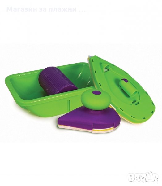 Четките са в два различни размера - малка и голяма. Голямата четка дава възможност за поставяне на удължителна дръжка, която е стандартна. Продава се във всички големи вериги и магазини за битови стоки. Въртейки се във всички посоки, тя прави боядисването лесно. Не натоварва кръста или ръката. Чрез нея се достига с лекота до тавана. Малката четка е снабдена с кръгла дръжка, чието предназначение е да изпипва детайлите, да боядисва ъглите и неудобните за достигане места, рамките на прозорците или вратите, до контакти, тесни пространства и много други. Комплектът съдържа два дунапренени валяка, които са във формата на ютия. Чрез тях много удобно се боядисват по-труднодостъпни и малки пространства. Това има дава голямо предимство пред валяците и четките. Отсичат перфектно без да цапат, без да се стича боя, да се подлива или изцапва всичко около вас. Двете четки (валяци) поемат нужното количество боя от специално конструираната за това роторна ваничка. Тя разпределя перфектно съдържанието и количеството боя по четката. Частите на комплекта са изработени от пластмаса. Те са в свеж елен и лилав цвят.