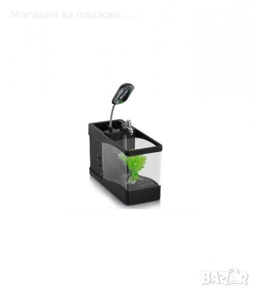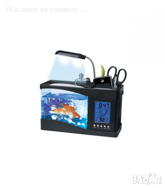 С него ще можете не само да отглеждате рибки на бюрото си. Този атрактивен мини аквариум има вграден LCD дисплей, на който ще виждате точната дата, ден от седмицата, час и температура в стаята. Освен всичко това, аквариумът има две отделни поделения, пригодени за прибиране на офис аксесоари, като химикали, листи, ножици, тикса и други нужни консумативи на място, където са ви постоянно под ръка. LED лампичката, която затопля водата в аквариума може да се огъва и деформира под всякакъв ъгъл, предоставяйки ви допълнителна светлина на бюрото за четене.