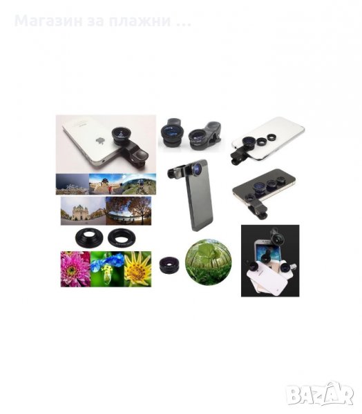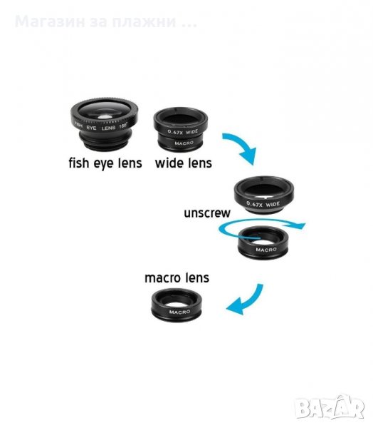 Обективите се завинтват на щипката. Получавате и удобна кесия в която да държите обективите си. Целия комплект се състои от 1бр. обектив fish eye, 1бр. обектив макро + микро (разглобяем, от 2 части), щипка за закрепване, удобна торбичка за обективите.