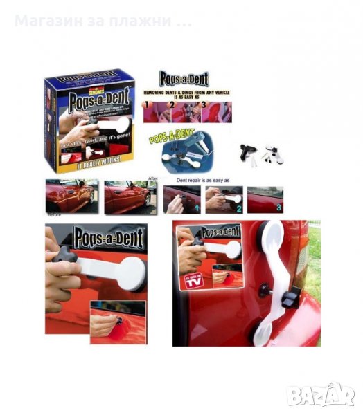 Със системата за изправяне на вдлъбнатини по купето на автомобила можеш сам за няколко минути да направиш ремонт на вдлъбнатините вследствие на градушка , натиснат калник или врата от колега шофьор на паркинга ,удар по купето на автомобила при невнимателно паркиране и т.н. Комплектът съдържа всички необходими компоненти и не изисква предварителна подготовка или квалификация