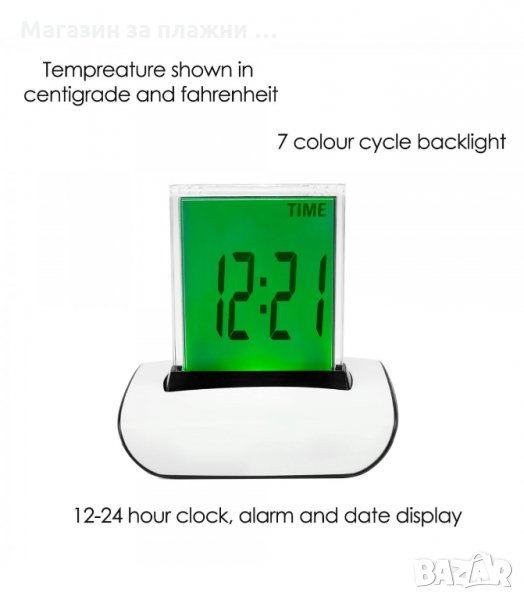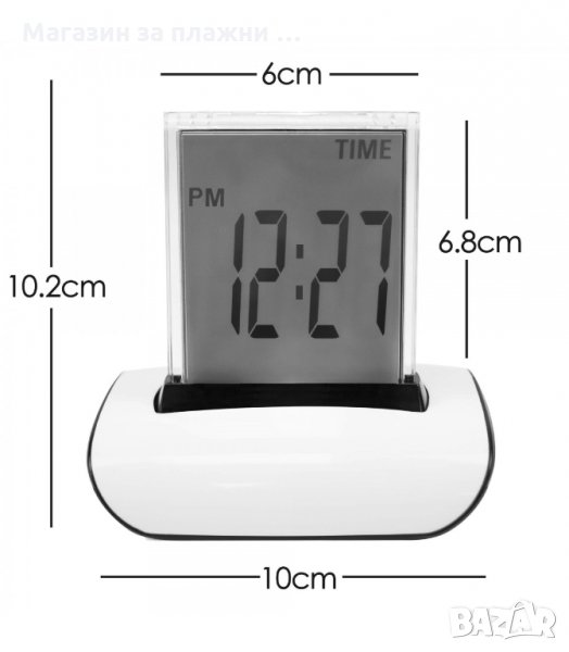 Това е настолен часовник. Той е с голям LED дисплей с размер: 5.10 см.
